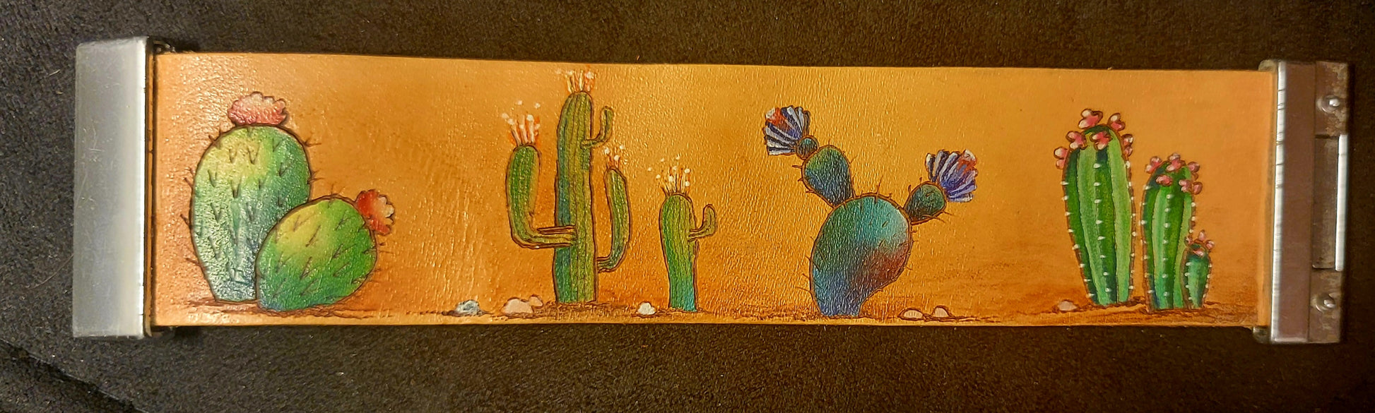 Leather bracelet with hand painted cacti with hand burned outline. Magnetic clasp 7 inches long