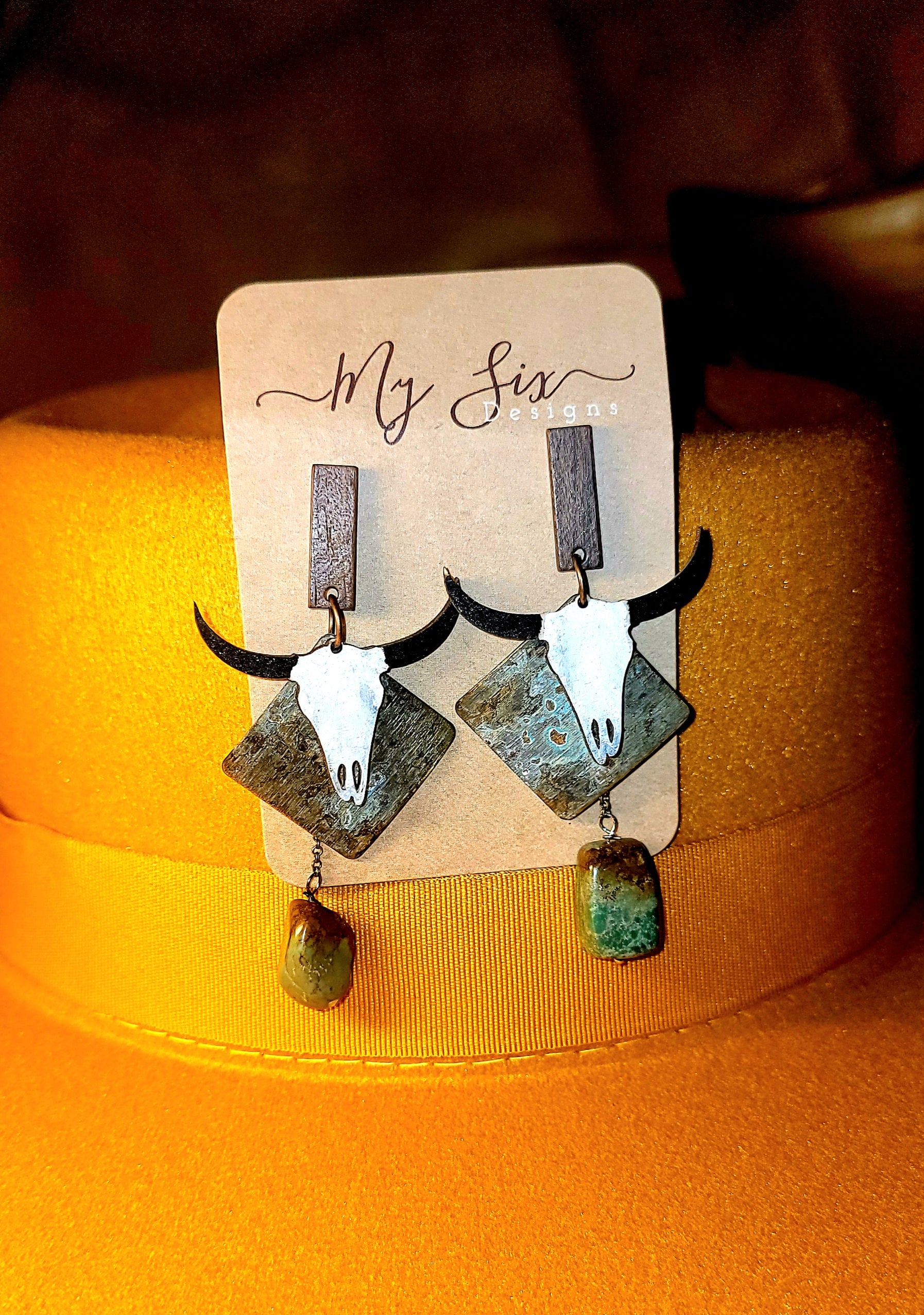 Earrings - Studs with Hand pained Wood Bull. Patina Brass and Turquoise accents.