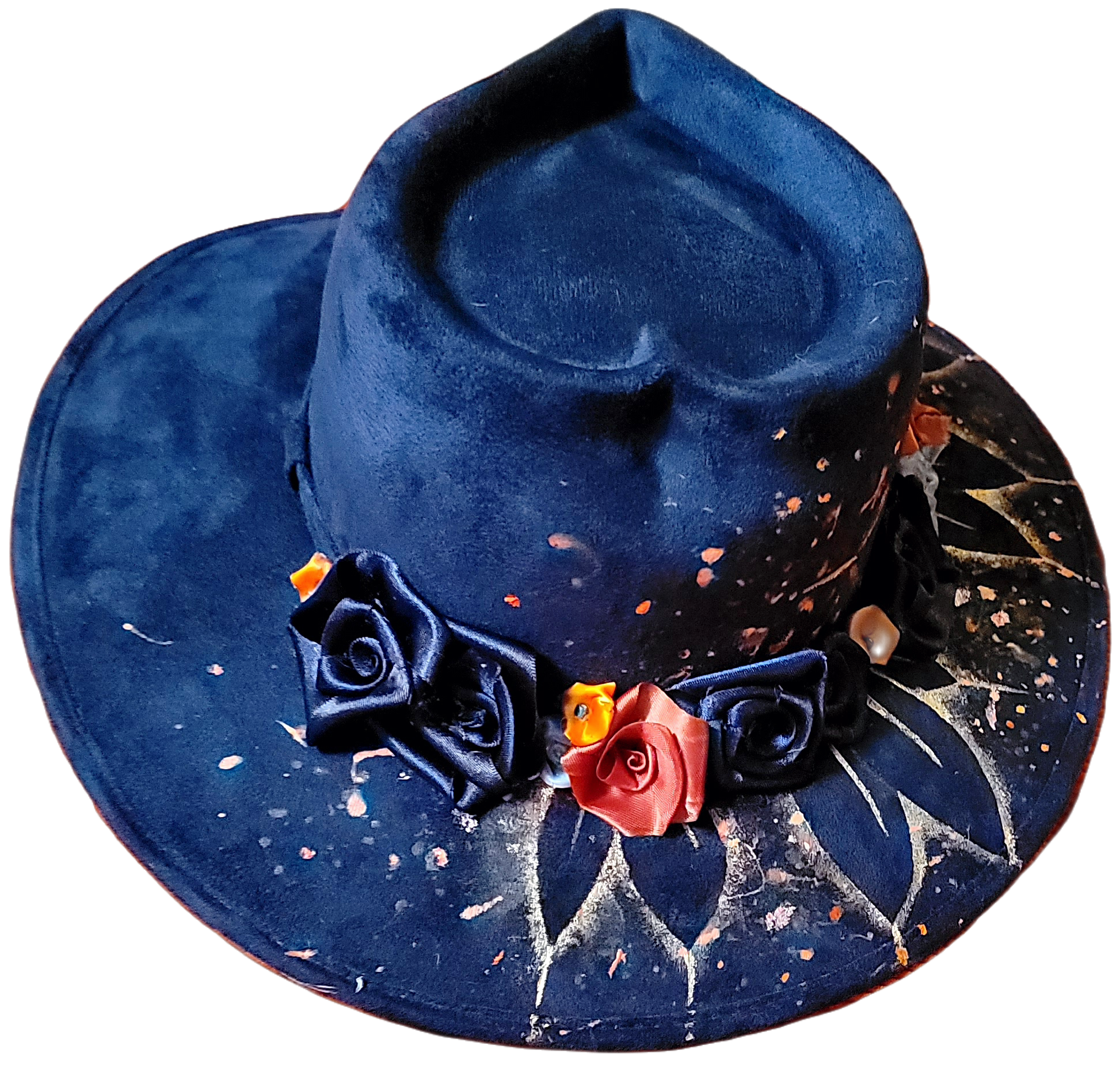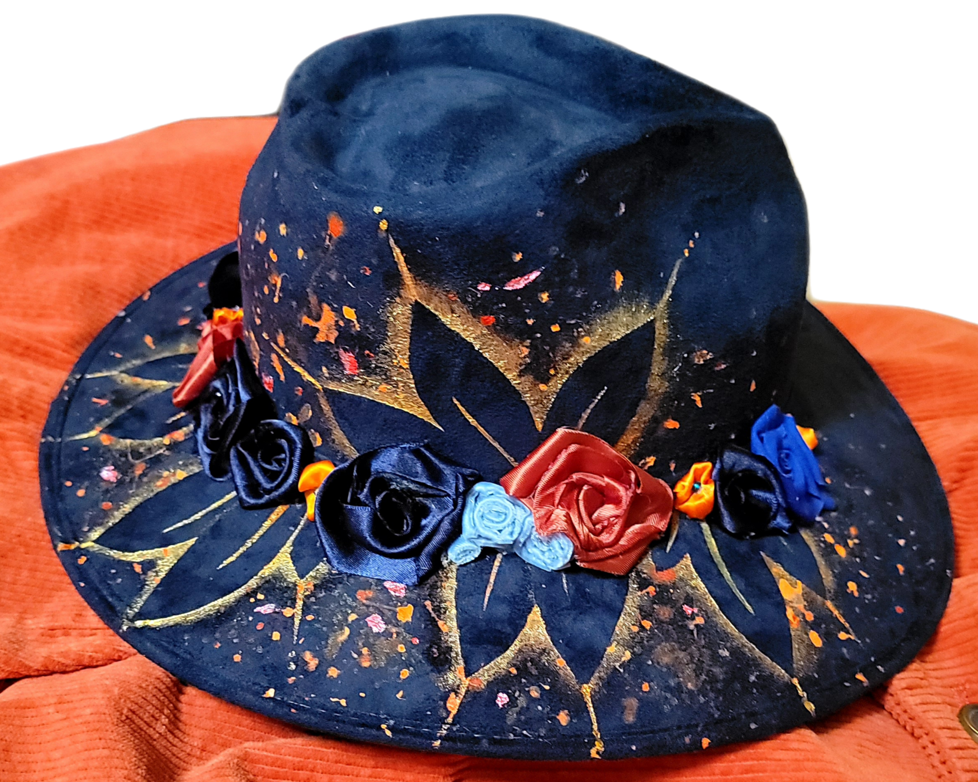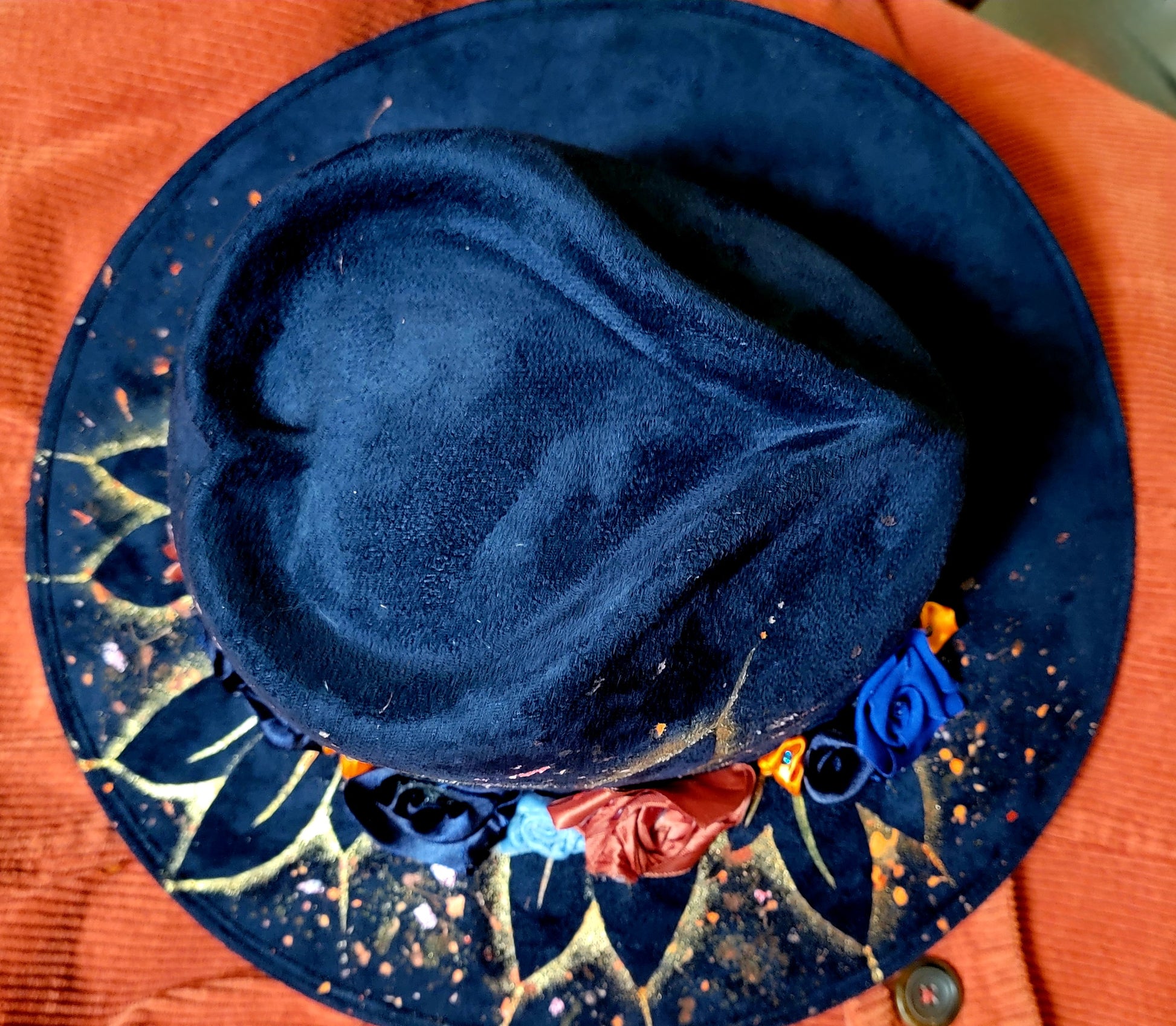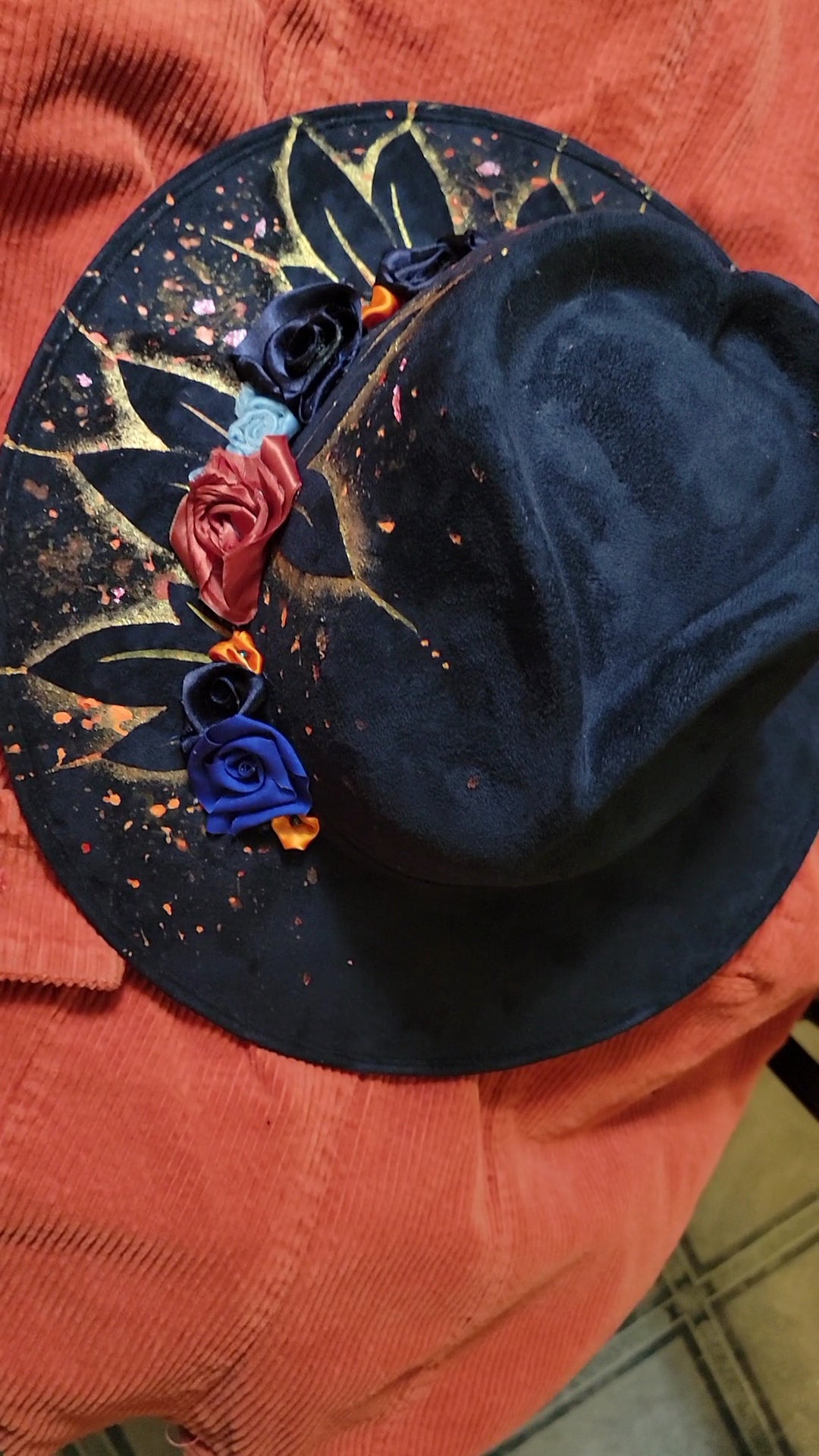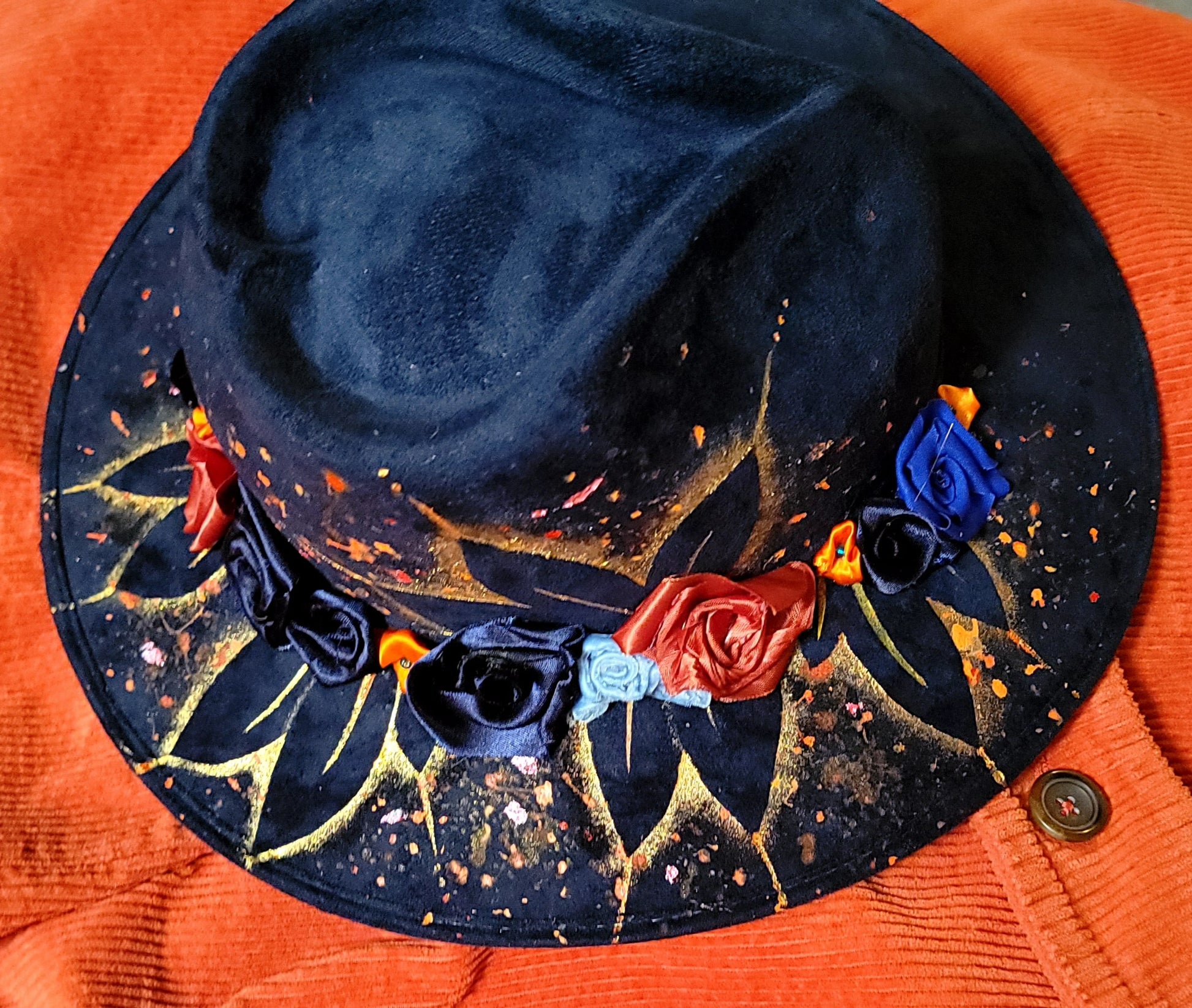 Hand painted Felt hat with hand made cloth flowers. 57 to 58cm