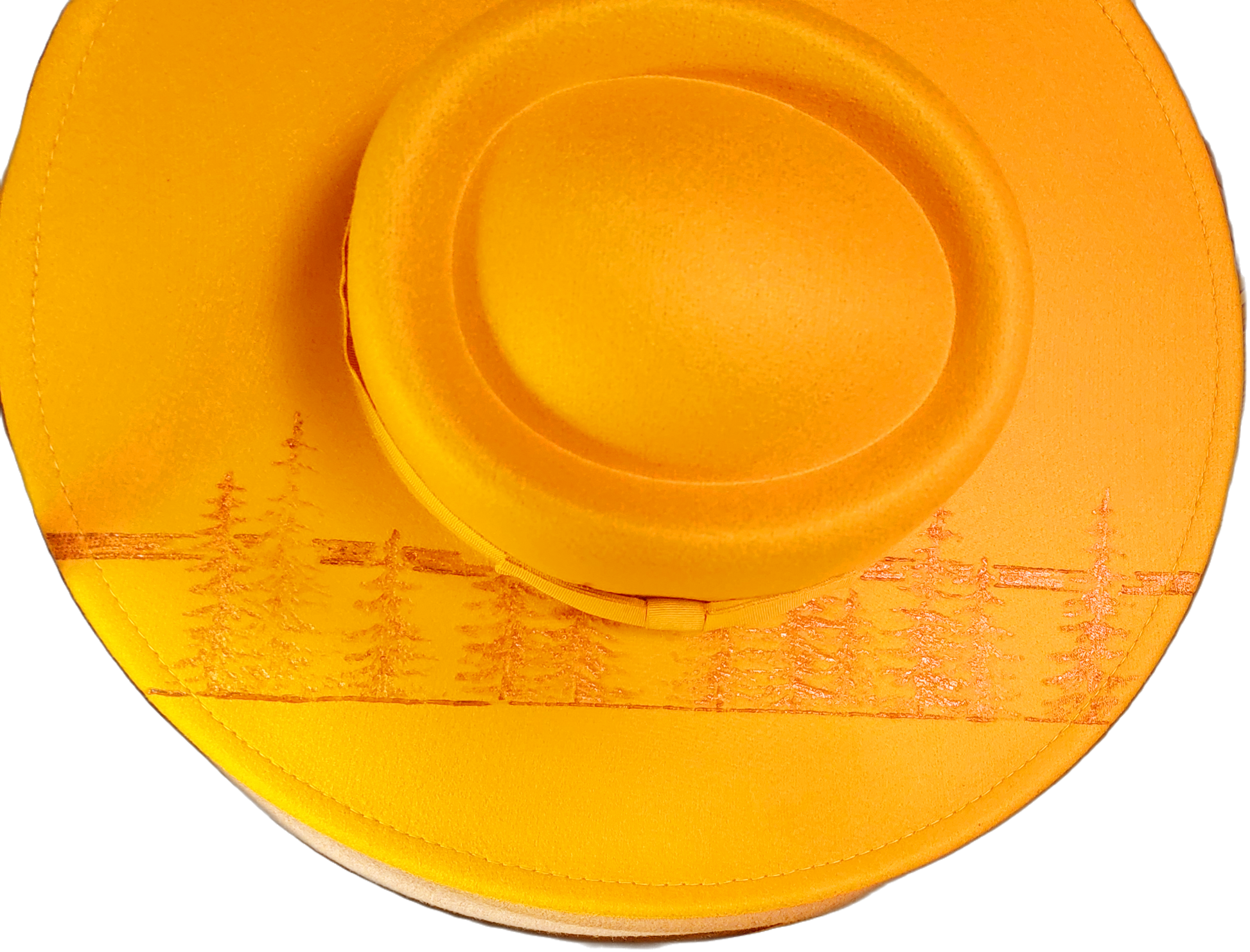 Golden yellow felt hat with hand burned tree line. 56 to 58cm adjustable size