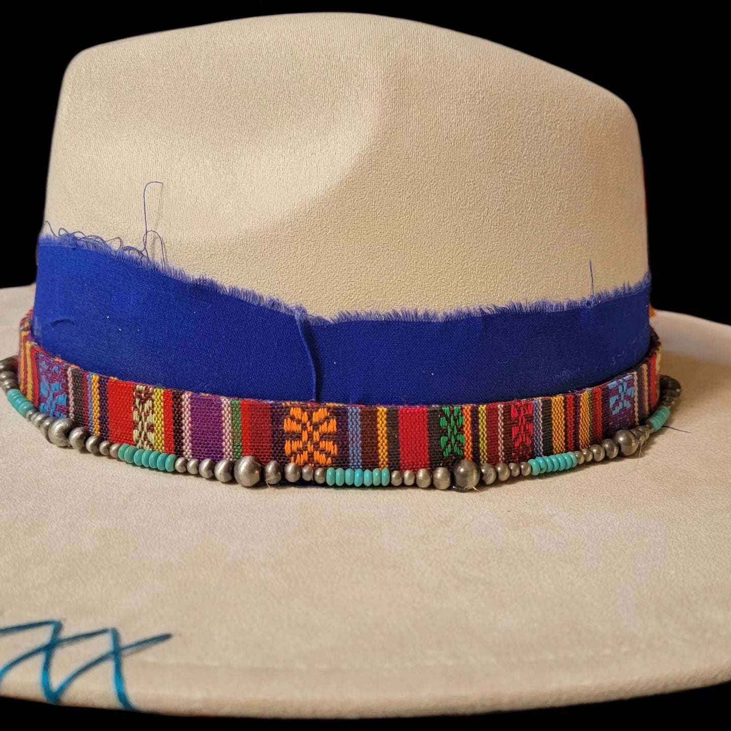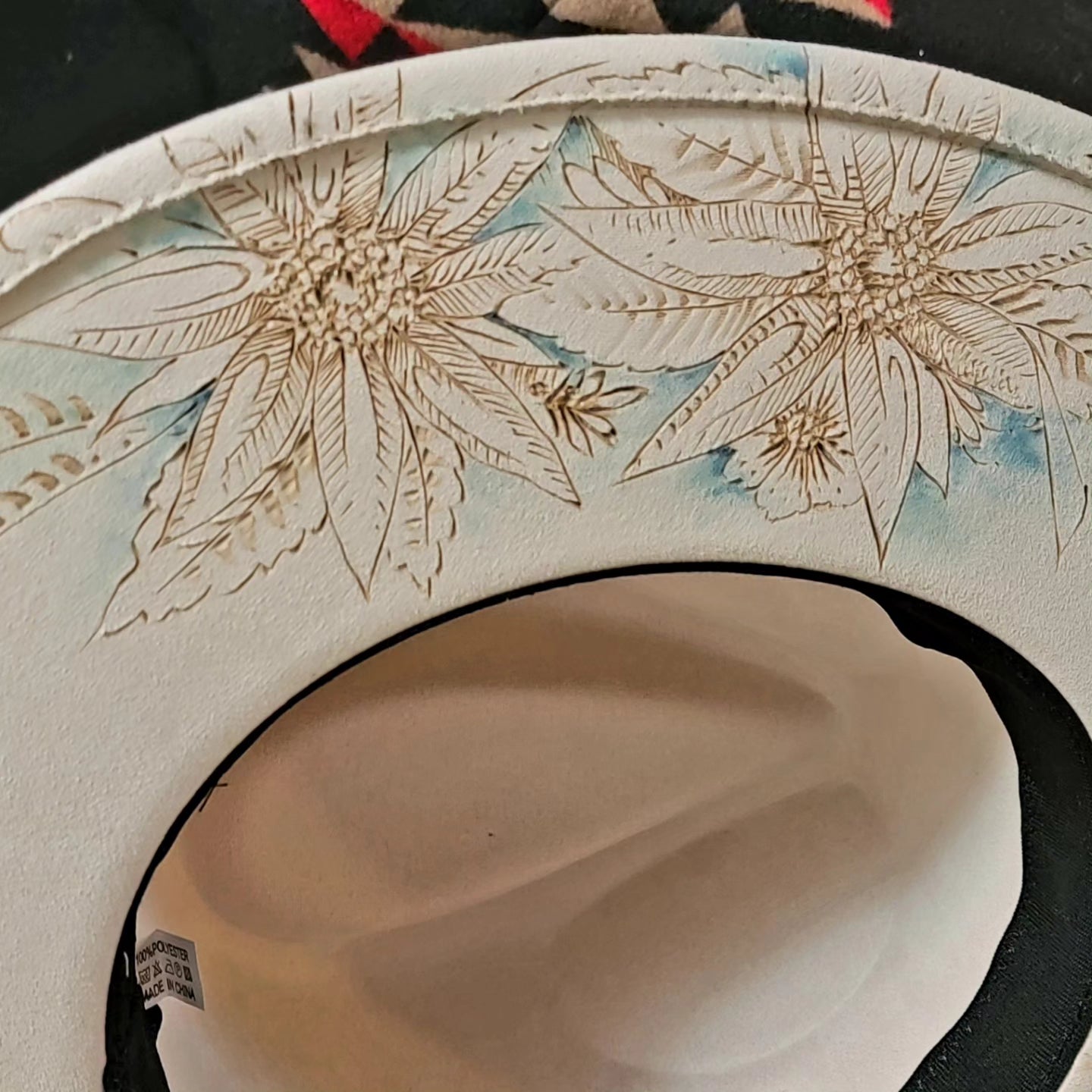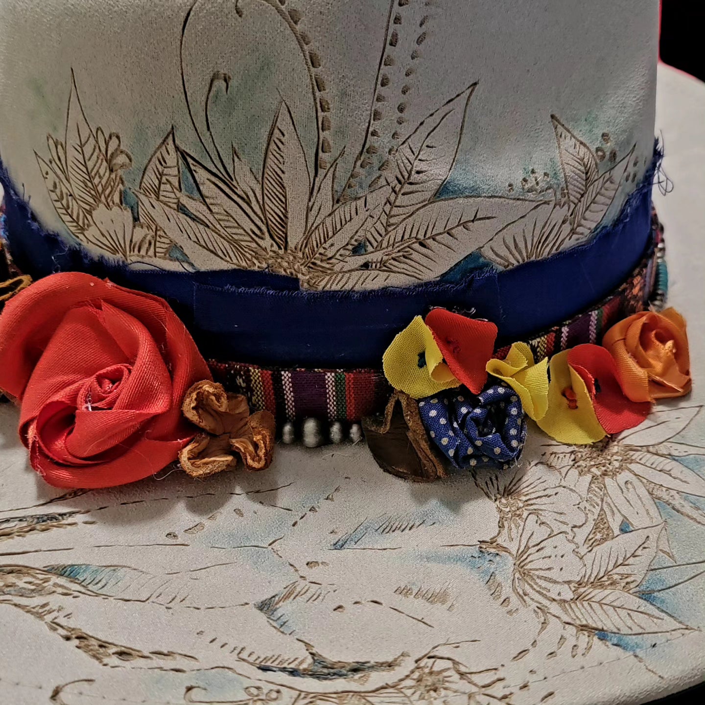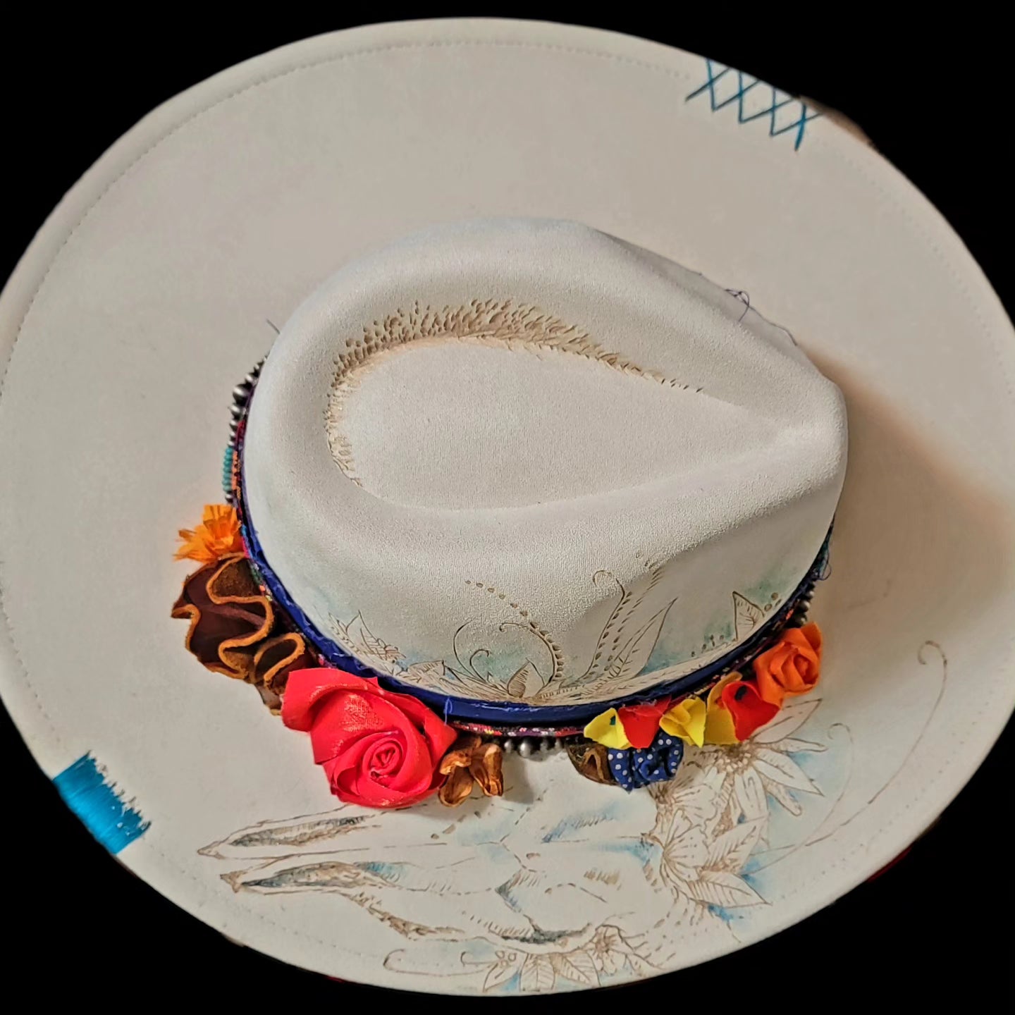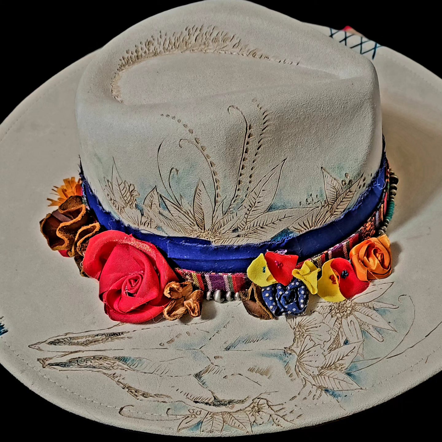 Hand painted Felt Hat with cloth and leather flowers