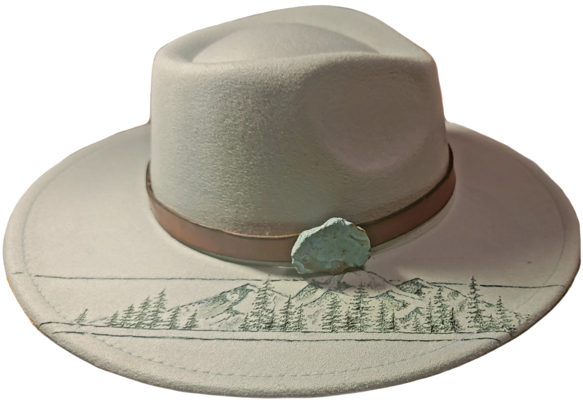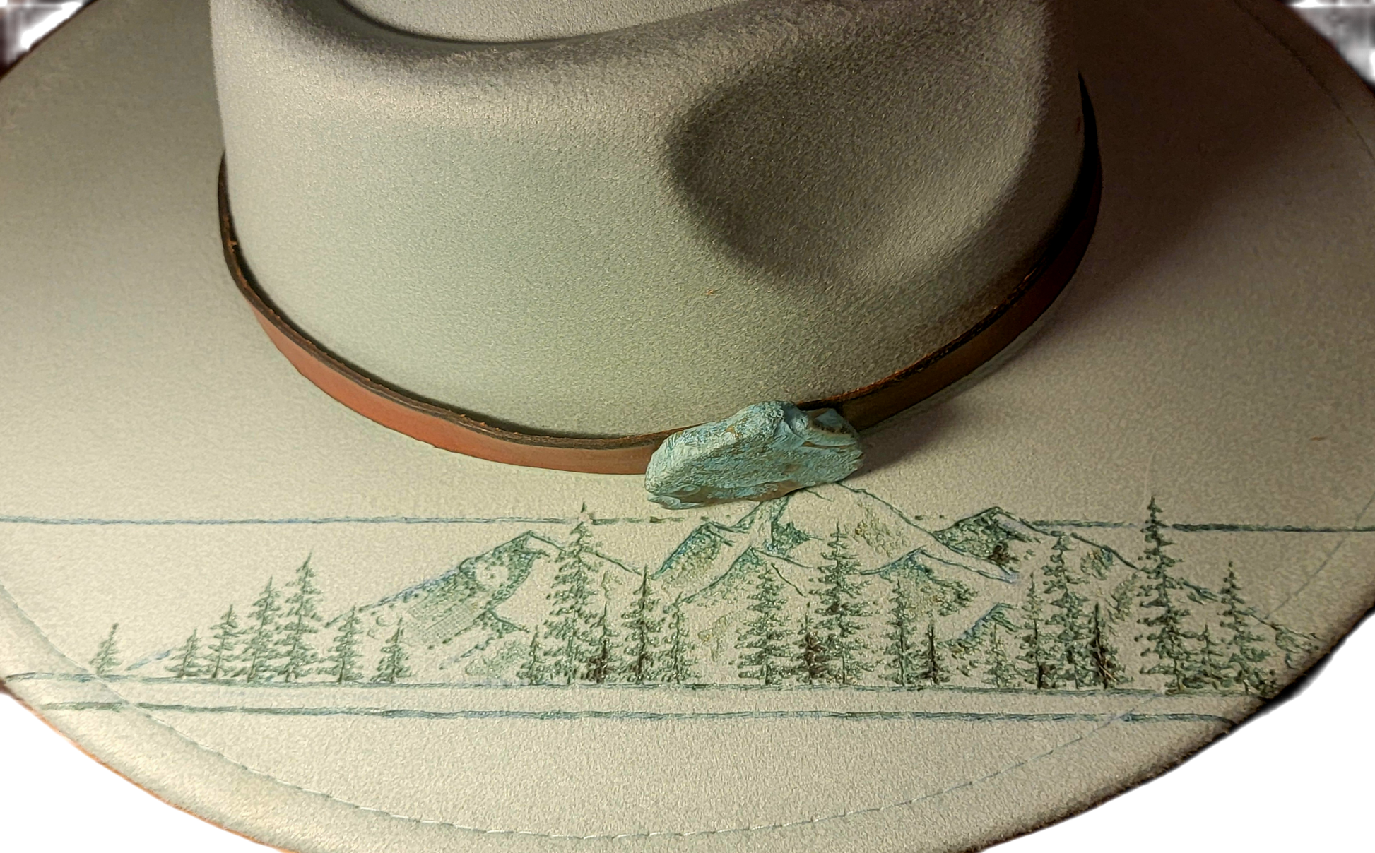 Mint felt hat with leather and turquoise hat band with metallic clasp. 55 to 59cm adjustable hat size